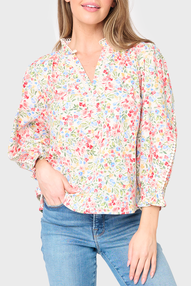 Presenting the Aria Poplin Blouse! Featuring a delicately trimmed split neckline adorned with a graceful ruffle, this blouse adds touch of feminine charm into every look. The pretty floral print and crochet-trimmed bracelet sleeves give this shirt a charming twist.