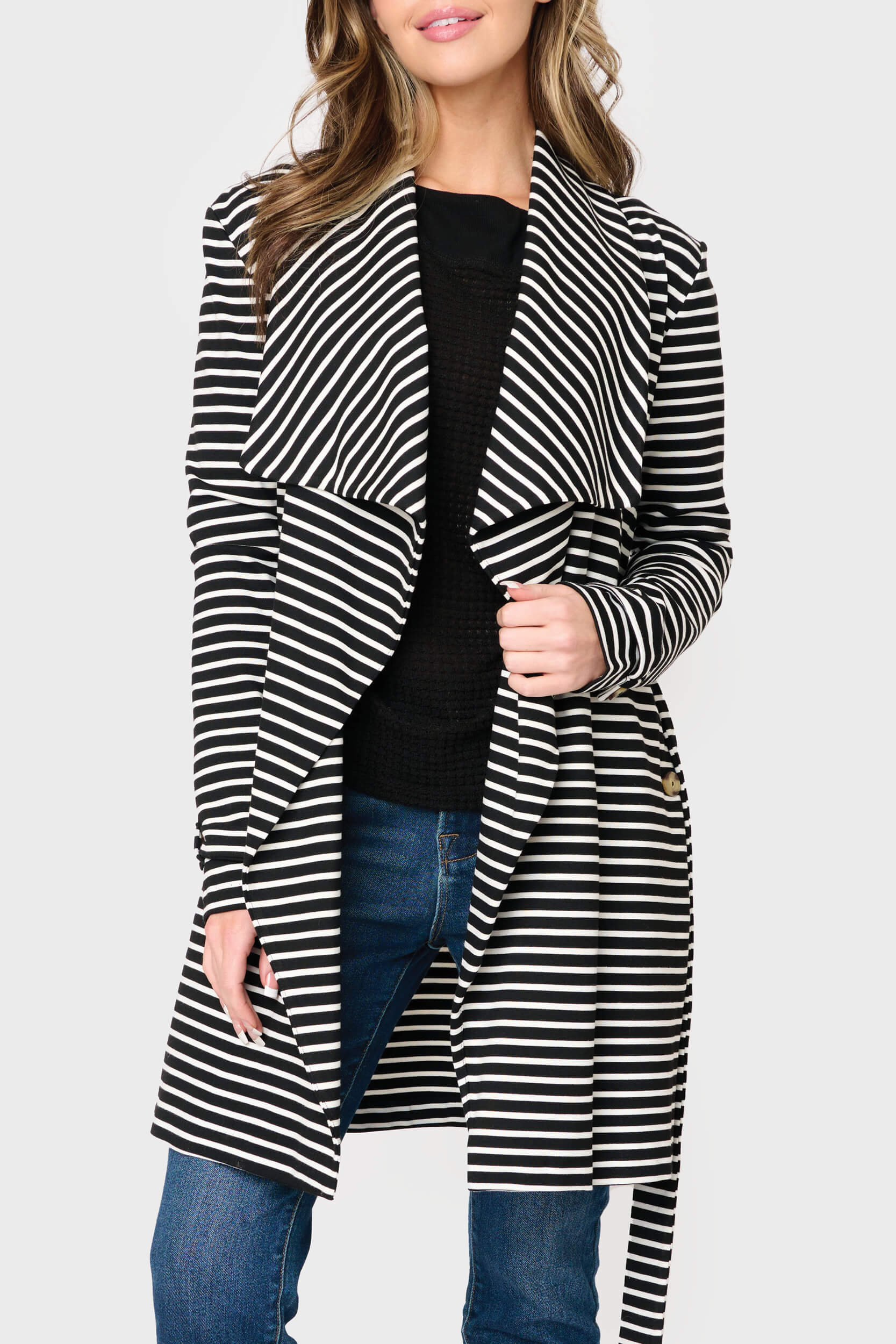 A versatile belted topper jacket features a waterfall lapel & a tie waist, all in soft ponte knit. Unlined.