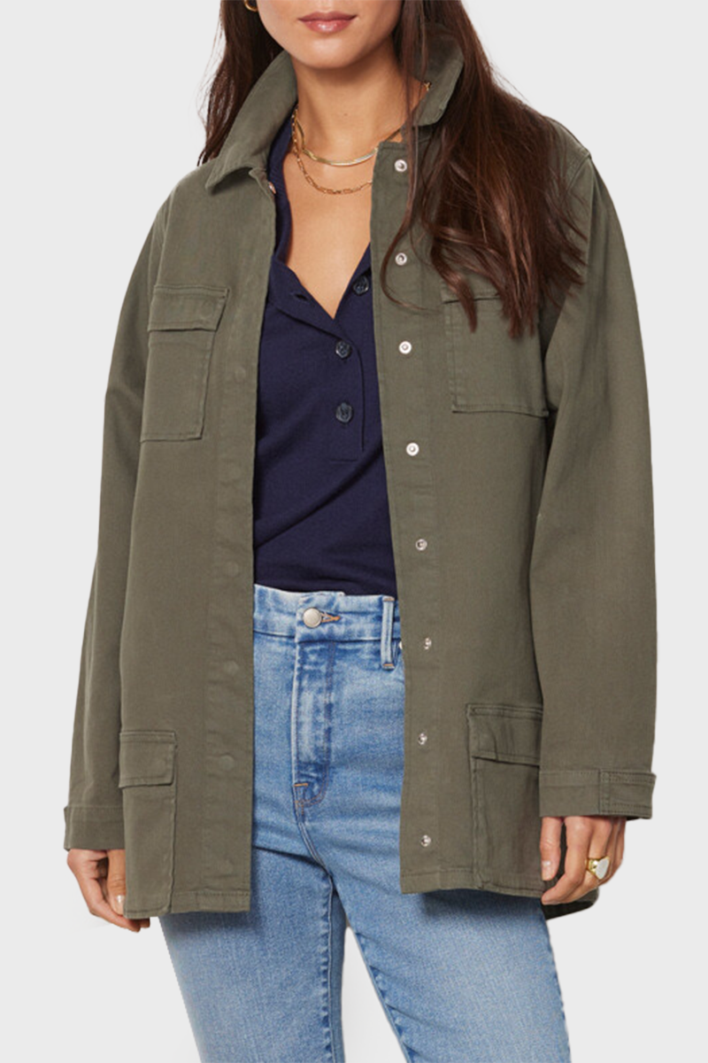 Crafted from a cotton twill fabric, this chic Good American utility jacket has an everyday look with an elevated feel. Featuring a point collar, snap front closure, and patch pockets, this layer looks stylish over a favorite tee or a sleek bodysuit.