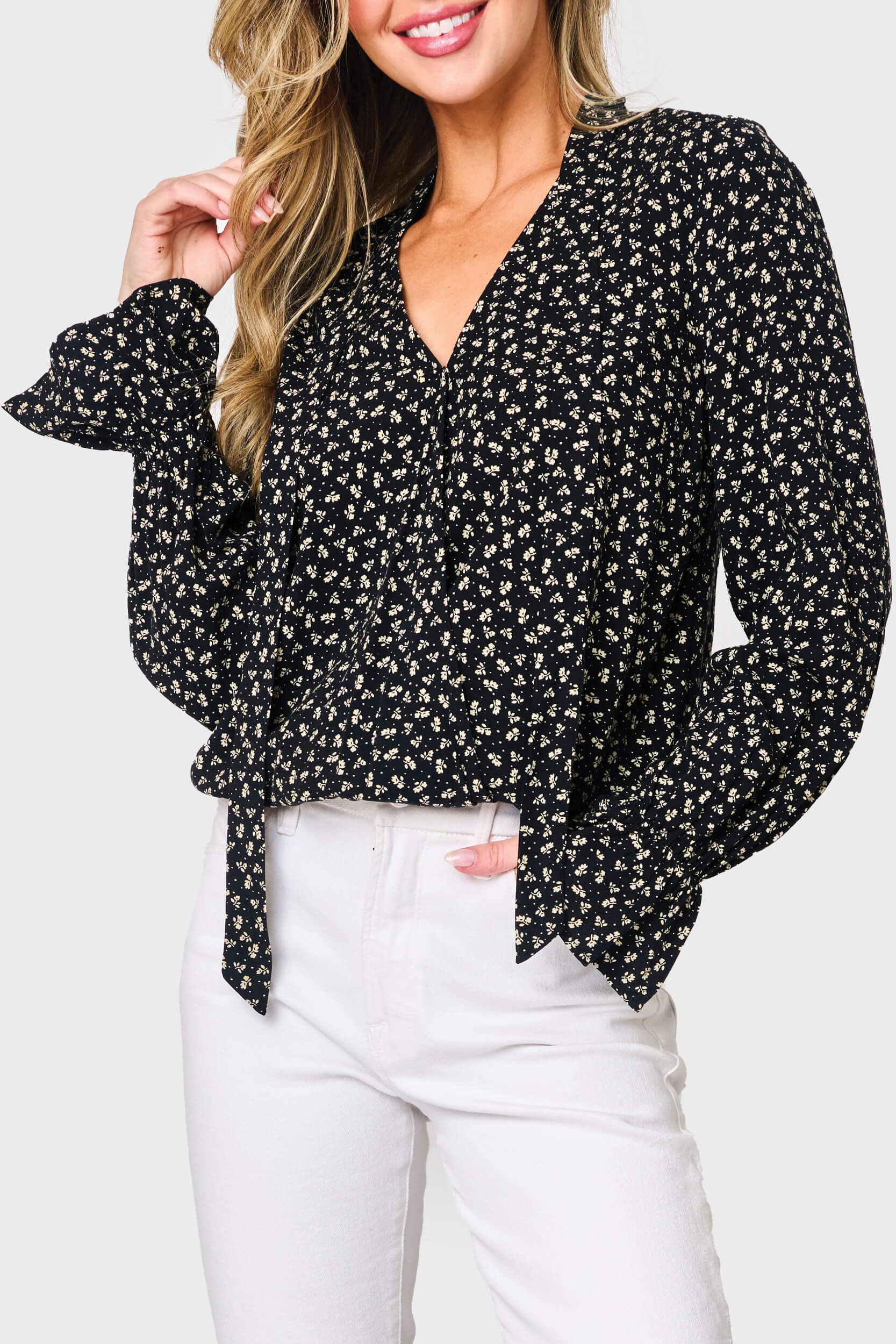 Elevate your everyday style with our Long Sleeve Surplice Blouse, designed for effortless sophistication. Crafted from lightweight woven, this blouse features a flattering surplice V-neck with secure snap closure, ensuring both comfort and elegance. The ruffle-trimmed sleeves and delicate neck ties add a romantic, feminine touch, making it a versatile piece for work, evening outings, or special occasions.