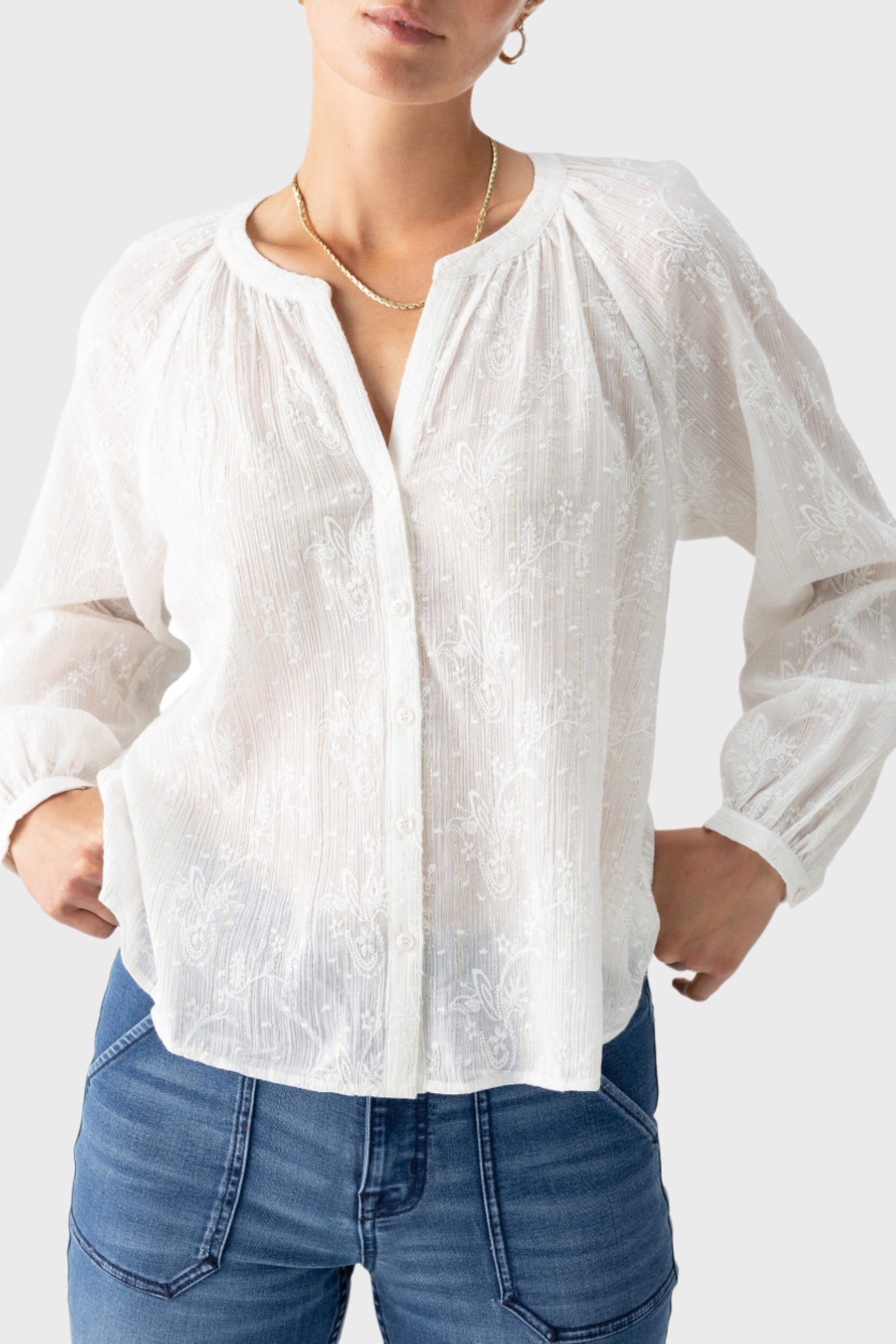 Shimmering metallic threads run through this Sanctuary laid-back cotton shirt, beautifully accented with tonal embroidered blooms.